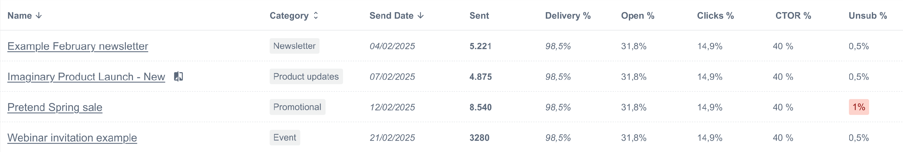 Cliquez sur un en-tête de colonne pour trier le tableau selon cette colonne. Cliquez à nouveau pour inverser l'ordre de tri. Ainsi, vous pouvez rapidement placer vos campagnes les plus performantes en haut en cliquant sur "Ouvert %".