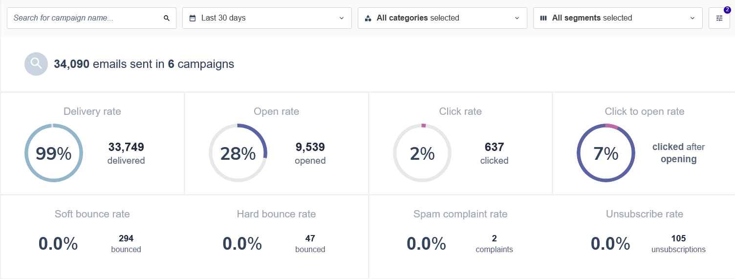 Naviguez vers Campagnes dans le menu principal et cliquez ensuite sur Rapports de campagnes. Le tableau de bord s'ouvre avec un aperçu de vos campagnes des 30 derniers jours.