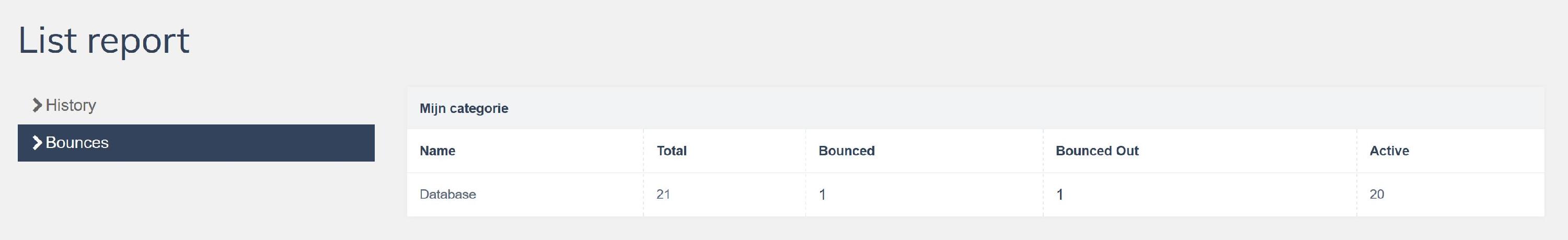 Dans le rapport sous forme de liste, se trouve un aperçu général comprenant l'historique de vos contacts dans la base de données ainsi qu’un aperçu de tous les rebonds enregistrés par le compte.