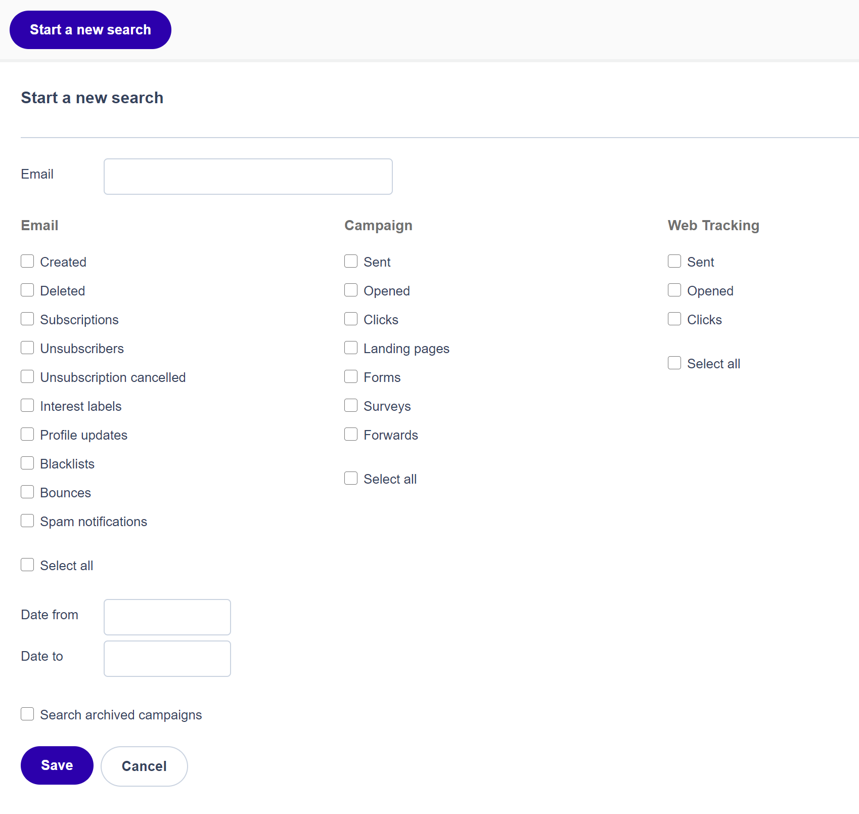 Vous pouvez choisir séparément les options ci-dessus mais aussi choisir l'option tout sélectionner pour rechercher une catégorie complète et cela pendant un certain laps de temps. De plus, vous pouvez également effectuer des recherches dans les campagnes archivées.