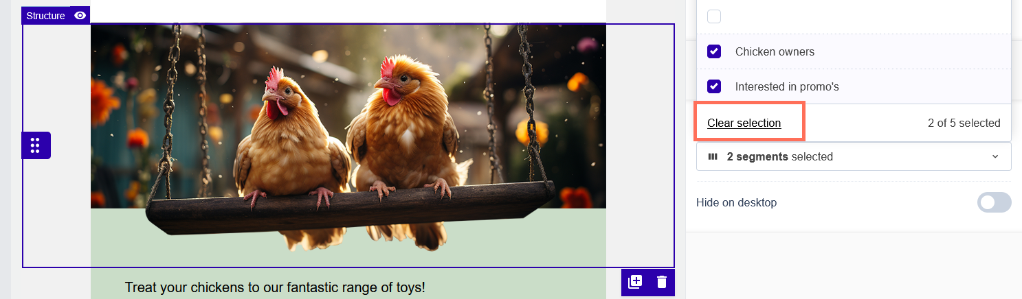 Ensuite, en bas du menu déroulant des segments, cliquez sur le lien "Effacer la sélection" pour supprimer la configuration de contenu dynamique appliquée à la structure.