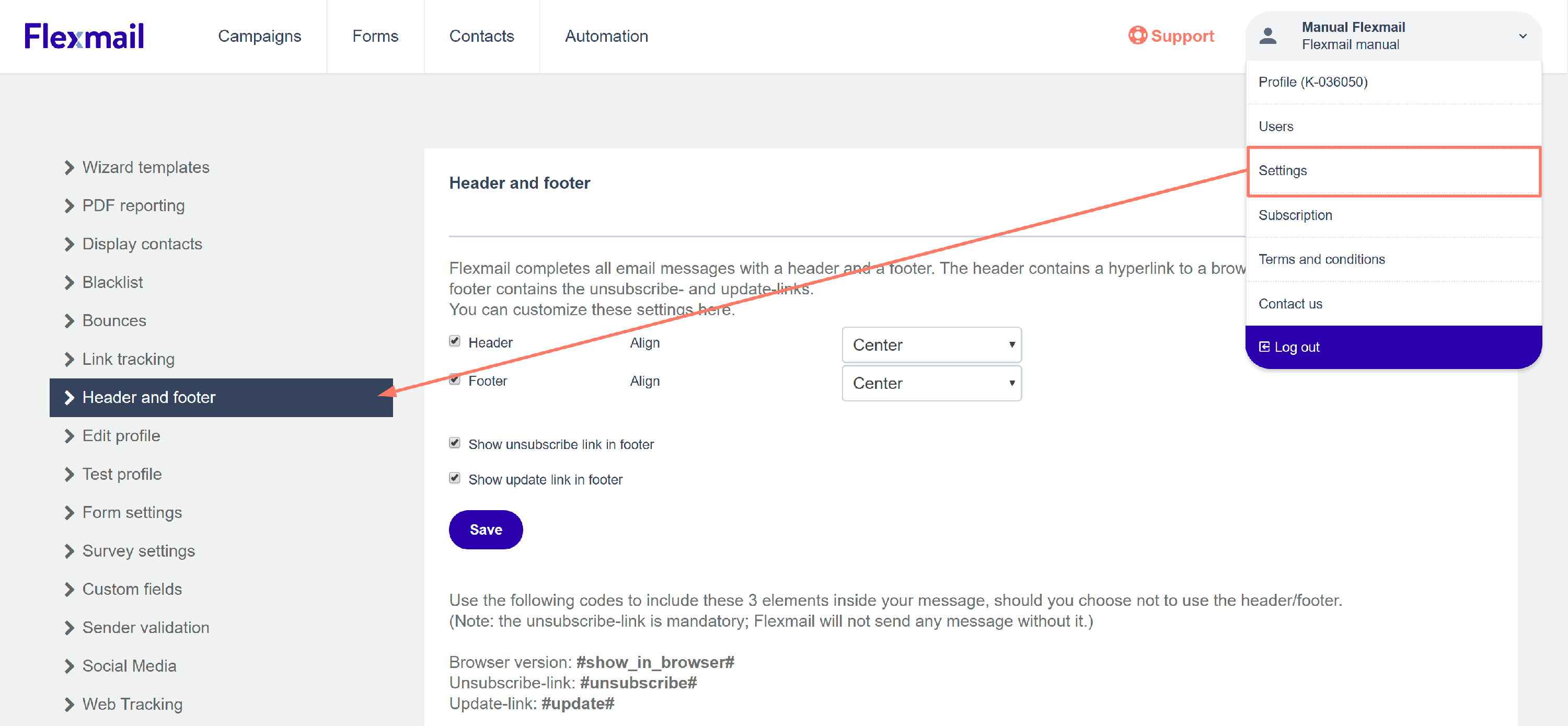 Tous les e-mails sont complétés par défaut par une en-tête et un pied de page. L'en-tête contient un hyperlien vers une version du message accessible par le navigateur. Le pied de page contient les liens de désabonnement et de mise à jour. Dans les paramètres de votre compte, vous pouvez ajuster la visibilité de l'en-tête et du pied de page de vos messages.
