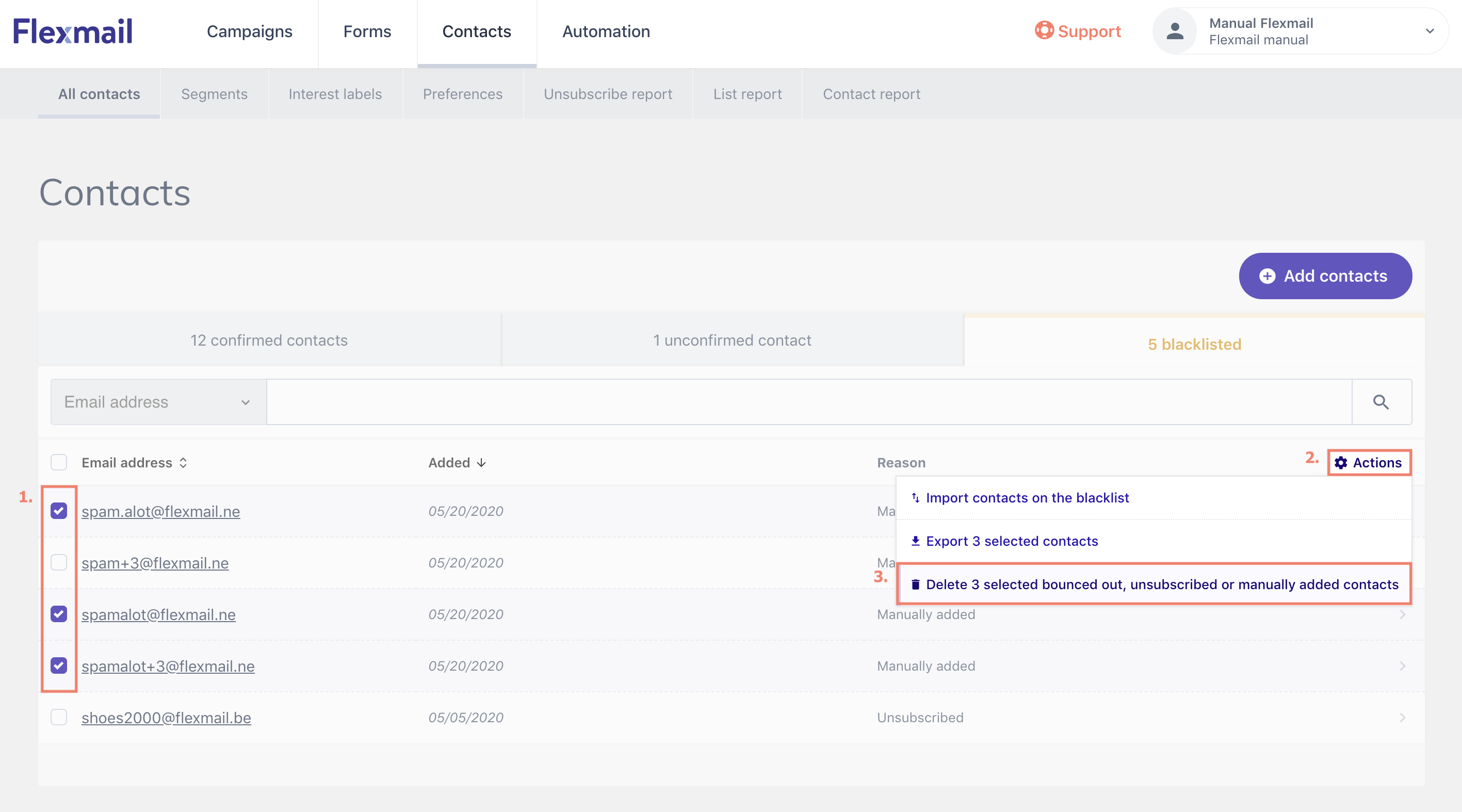 Si vous souhaitez supprimer plusieurs contacts à la fois, dirigez-vous vers l'aperçu de vos contacts > l’onglet Blacklisté. Cochez les cases devant les contacts que vous souhaitez supprimer et cliquez sur l'icône d’Actions en forme de roue dentée et sélectionnez Supprimer les (nombre) contacts "bounced out", désabonnés ou ajoutés manuellement. Confirmez ensuite que vous êtes certain de vouloir supprimer les contacts sélectionnés dans la blackliste.