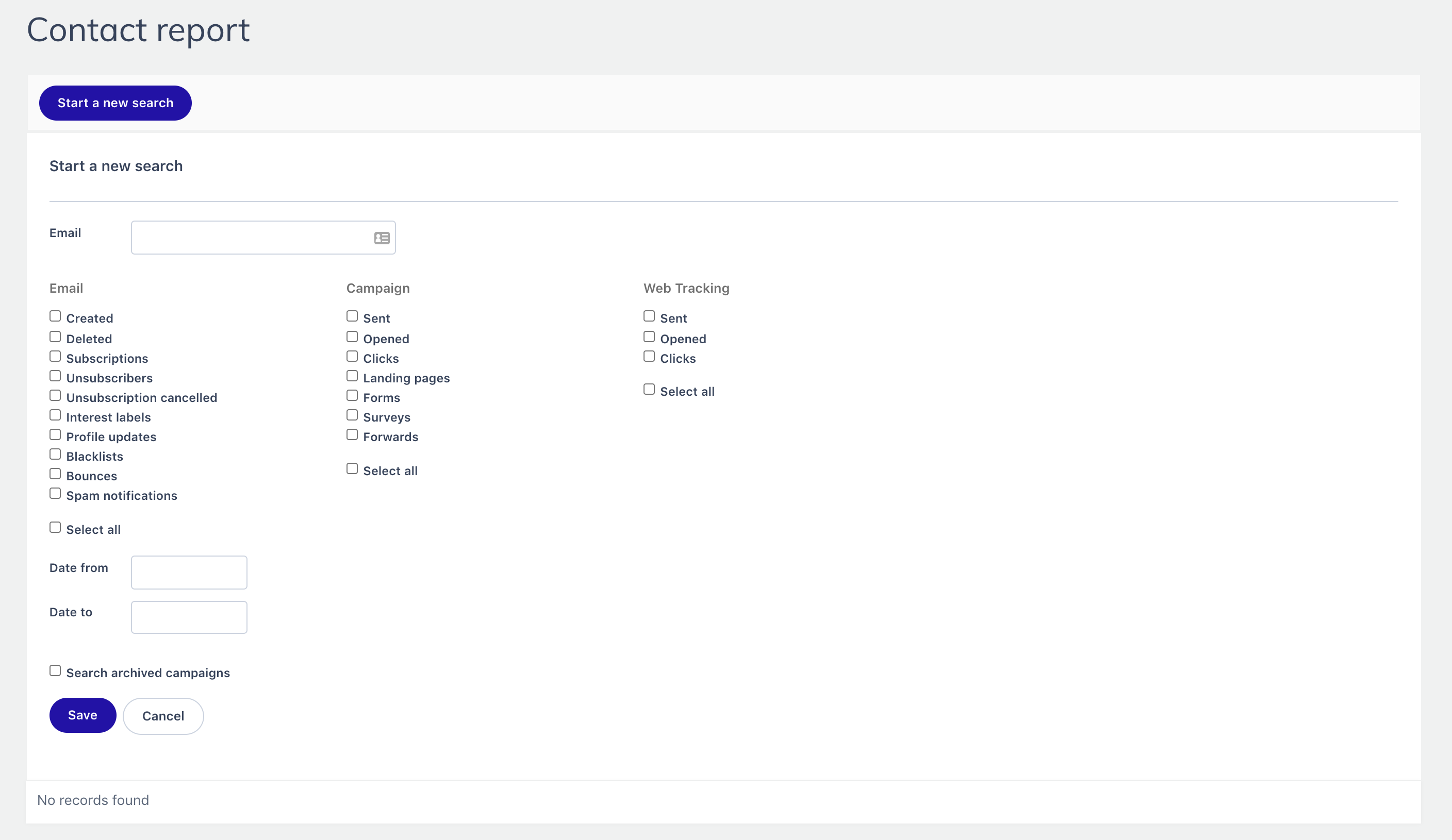 - Ensuite, choisissez les actions que vous souhaitez ajouter. Vous pouvez choisir entre les actions des catégories Email, Campagne et / ou Web Tracking. Sous ces catégories, vous pourrez choisir de réaliser différentes actions. Par exemple, vous pouvez rechercher toutes les campagnes envoyées à ce même contact ou voir quelles mises à jour de profil ont été effectuées après avoir reçu un e-mail particulier. De cette manière, vous pourrez davantage améliorer votre rapport. Ou vous pouvez simplement sélectionner toutes les actions en cochant la case Sélectionner tout, et cela pour chaque catégorie de manière individuelle.