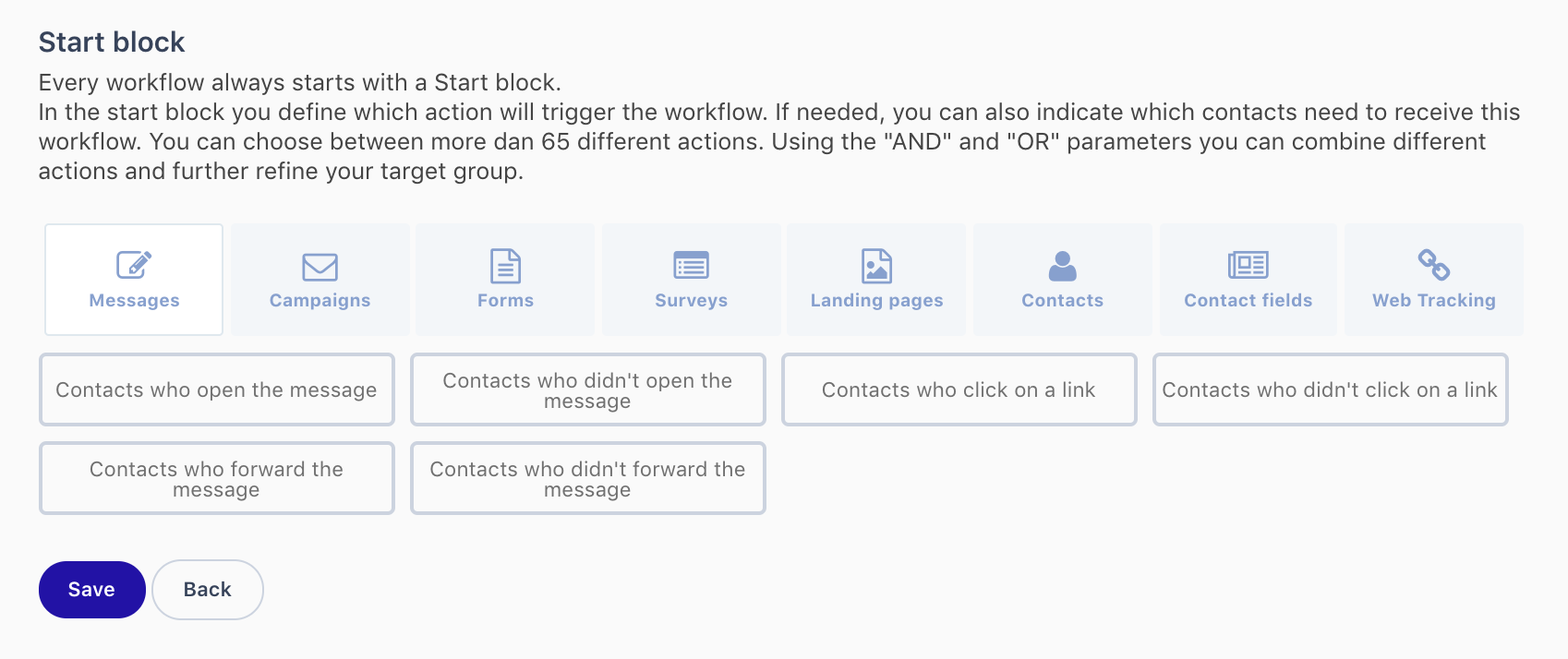 Le bloc Attendre et le bloc IF/ELSE sont un peu différents de toutes les autres actions. Contrairement à toutes les autres, si vous sélectionnez un bloc Attendre ou un bloc IF/ELSE, vous devrez définir un déclencheur pour ces actions. Vous pouvez combiner les déclencheurs à l'aide des paramètres AND/OR. Avec le paramètre AND, les contacts devront correspondre à tous les déclencheurs que vous avez configurés pour activer le bloc IF/ELSE. Avec le paramètre OR, les contacts devront correspondre à l'un des déclencheurs que vous avez configurés.