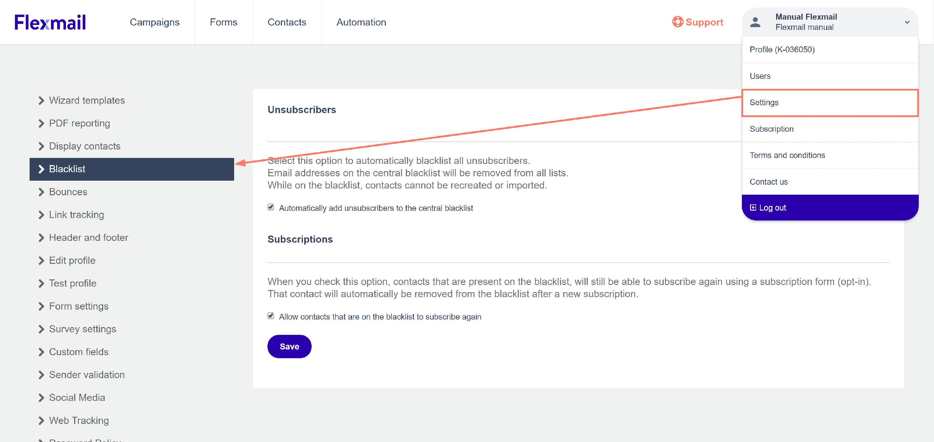 Lorsqu'un contact précise qu'il ne souhaite pas recevoir d'e-mails de votre part par le biais du lien de désabonnement figurant au bas des emails, il est automatiquement déplacé vers votre blackliste. Toutefois, il peut toujours s'abonner à vos messages s'il change d'avis. Dans les paramètres de votre compte, vous pouvez trouver ces deux paramètres et les modifier si nécessaire.