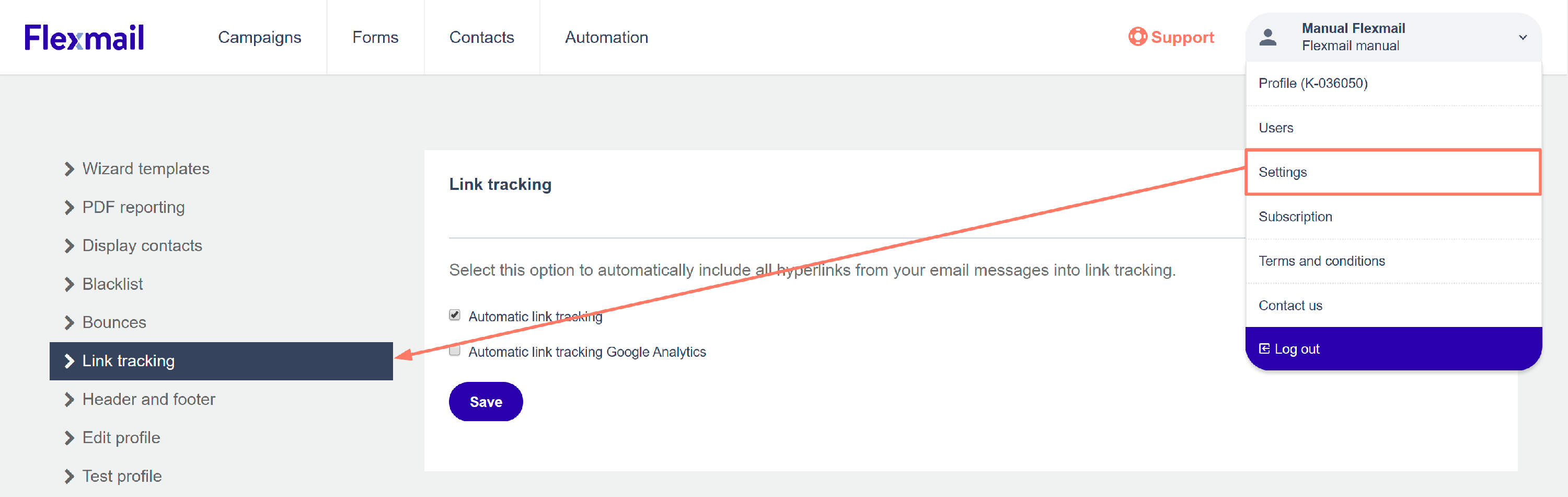 - Indiquez si vous souhaitez intégrer automatiquement tous les hyperliens de vos messages électroniques dans le Suivi de lien et/ou Google Analytics et Sauvegarder.