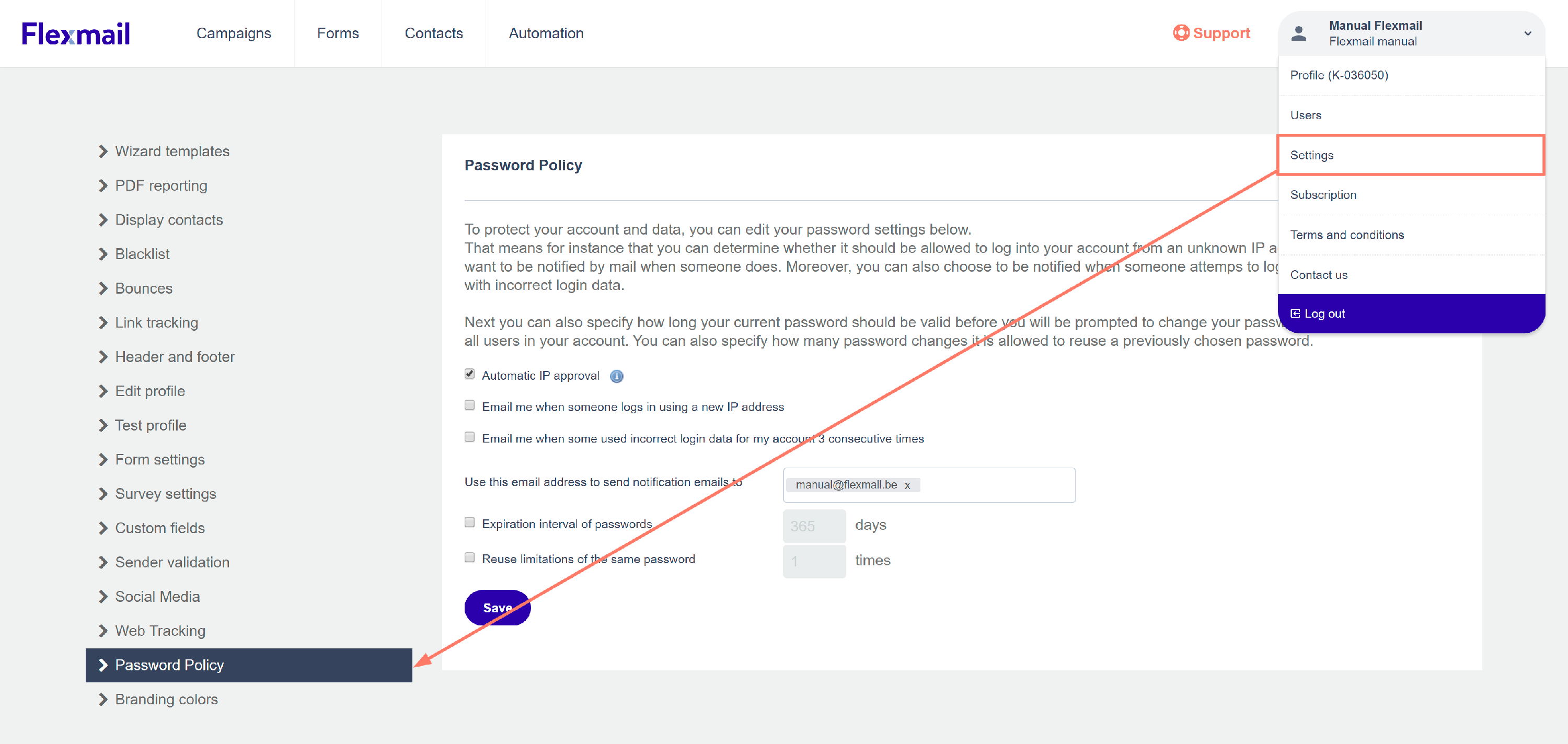 La sécurité de votre compte et de vos données est très primordiale à nos yeux. Pour y veiller, nous vous recommandons de définir vos paramètres de mot de passe à l'aide des mesures proposées par Flexmail, surtout si votre compte regroupe plusieurs utilisateurs.